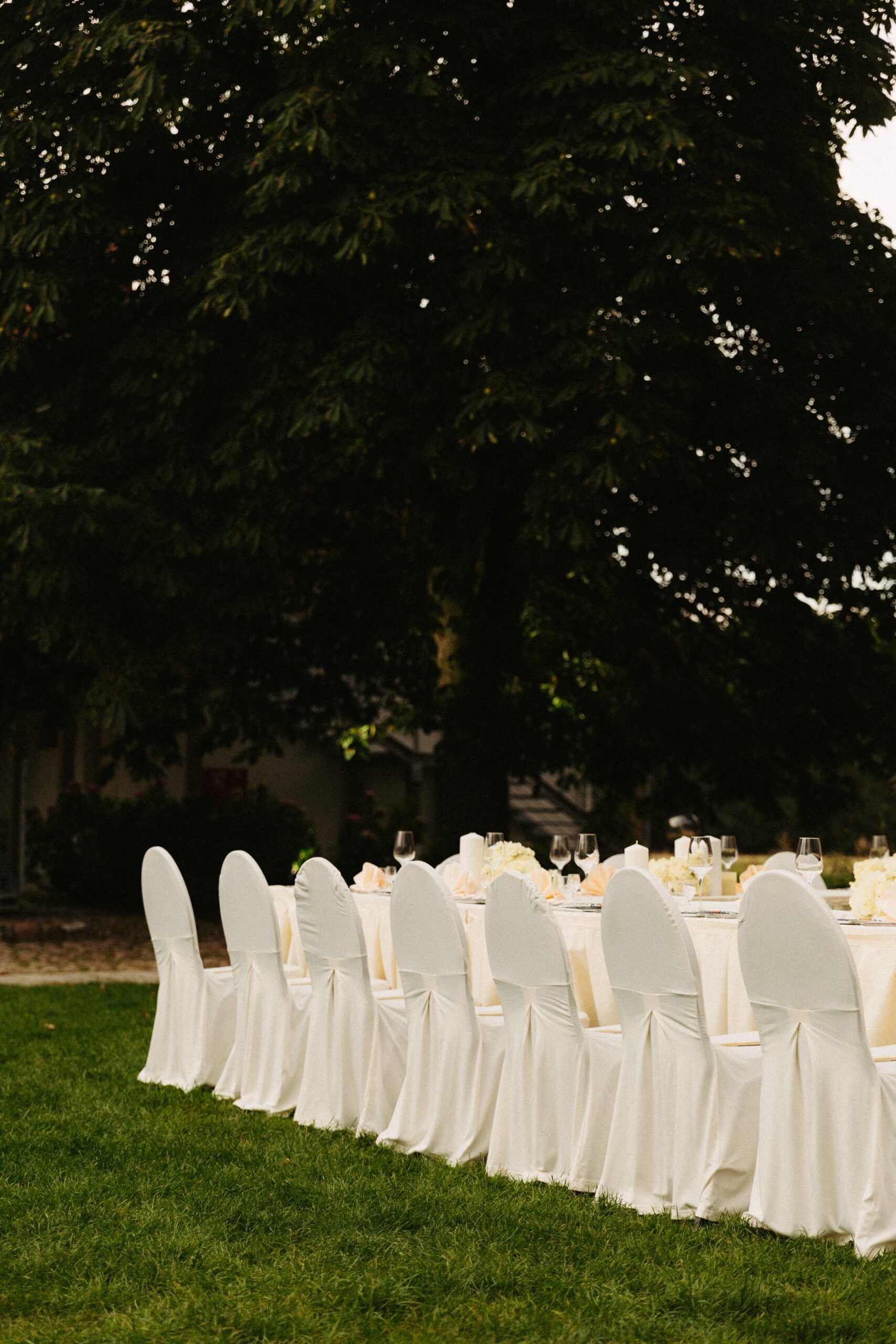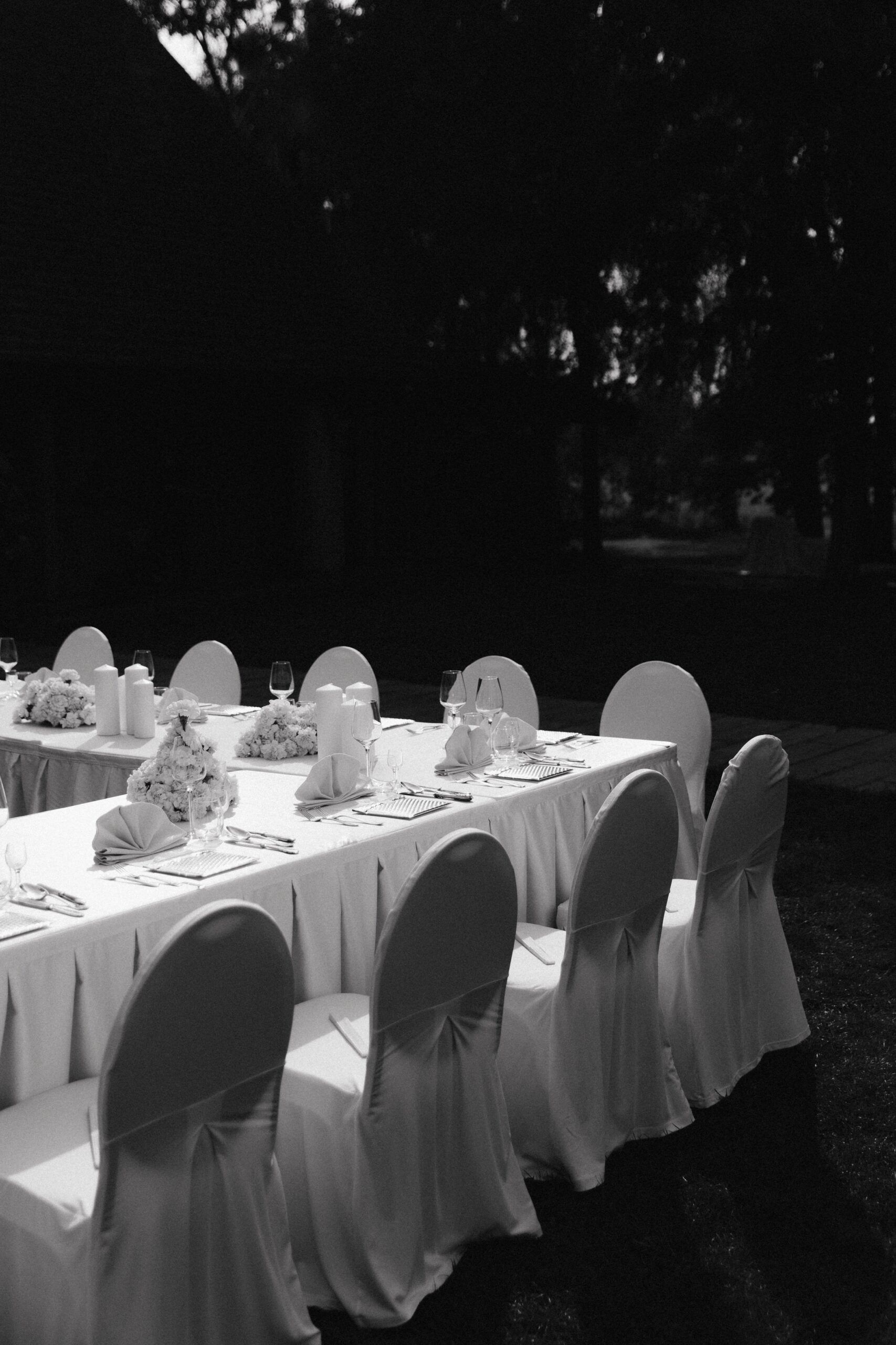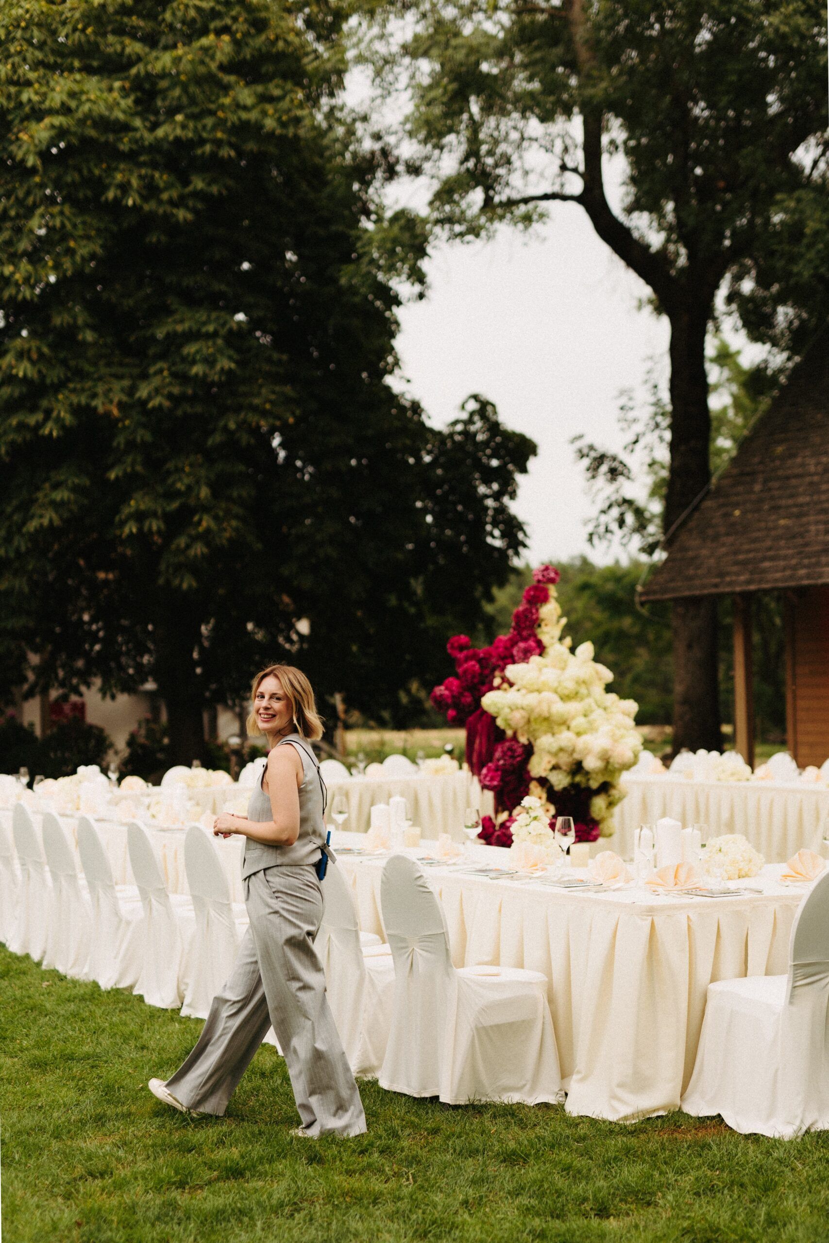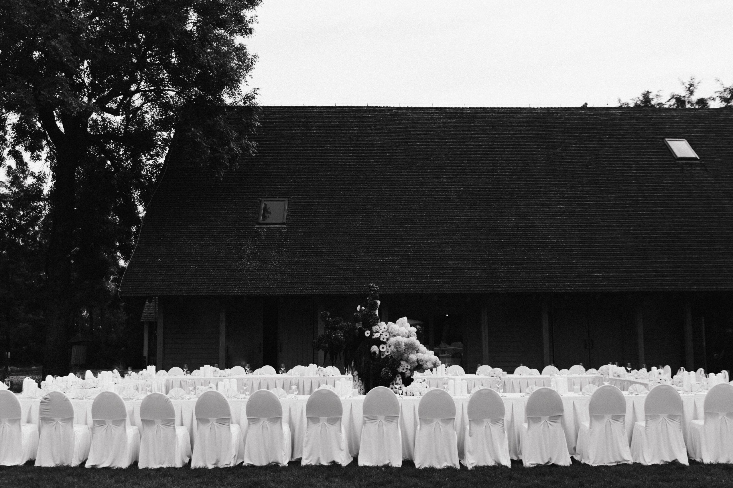 Projekt dla Pauliny i Pawła spełniał wszystkie te założenia. Paulinie zależało aby wesele odbyło się na trawie pod gwiazdami. Naszym zamysłem było intymne, inkluzywne usadzenie gości przy jednym stole. Bez osobnego stołu dla pary młodej. Skupiliśmy się na monochromatycznej kolorystyce aby, wbrew pozorom, jeszcze bardziej wybrzmiał każdy najmniejszy szczegół.
