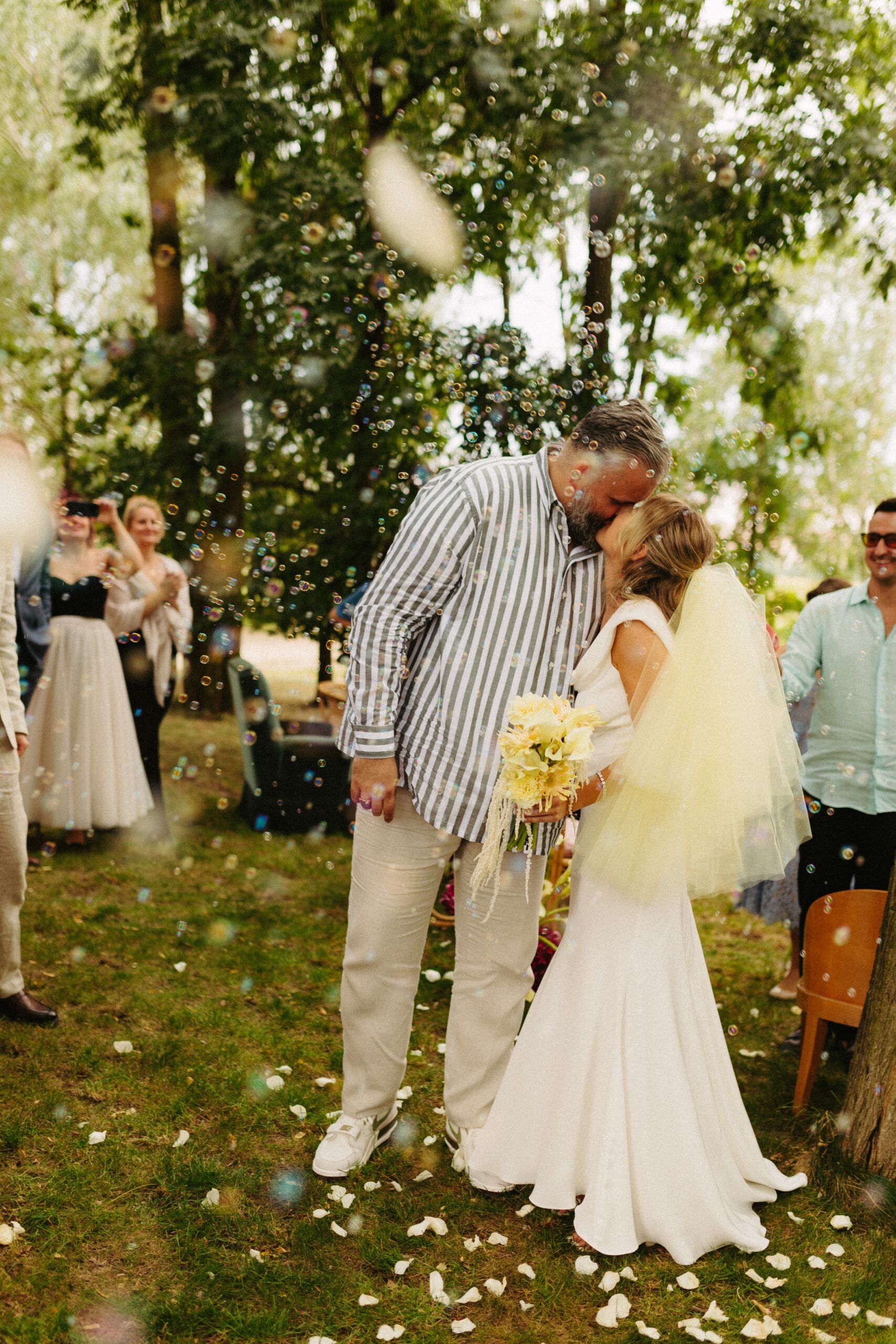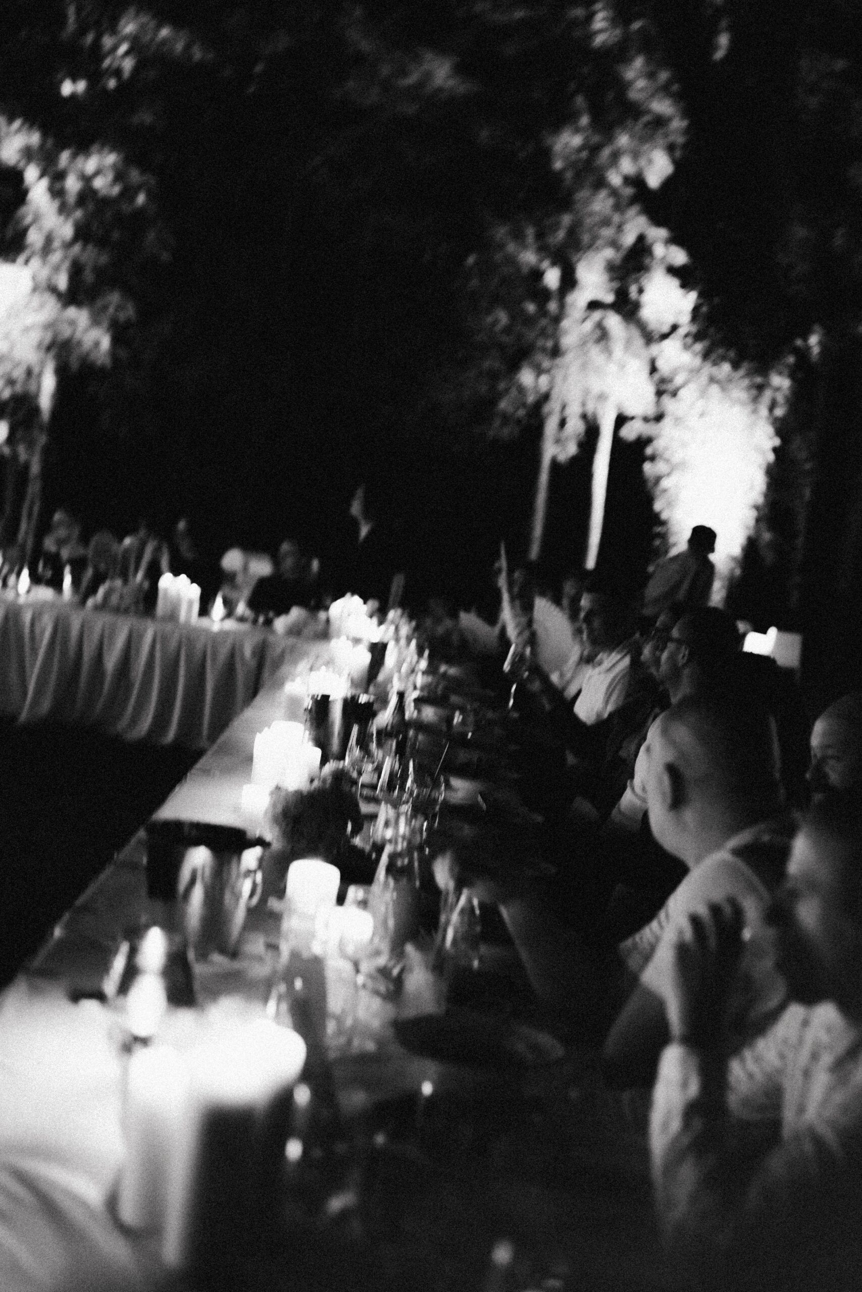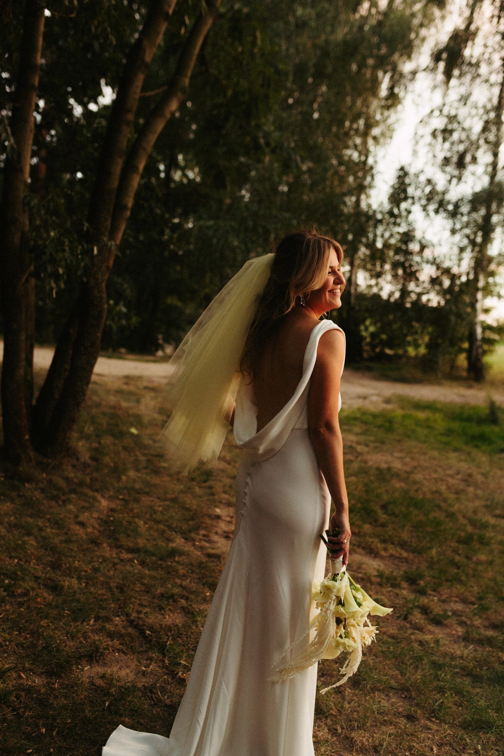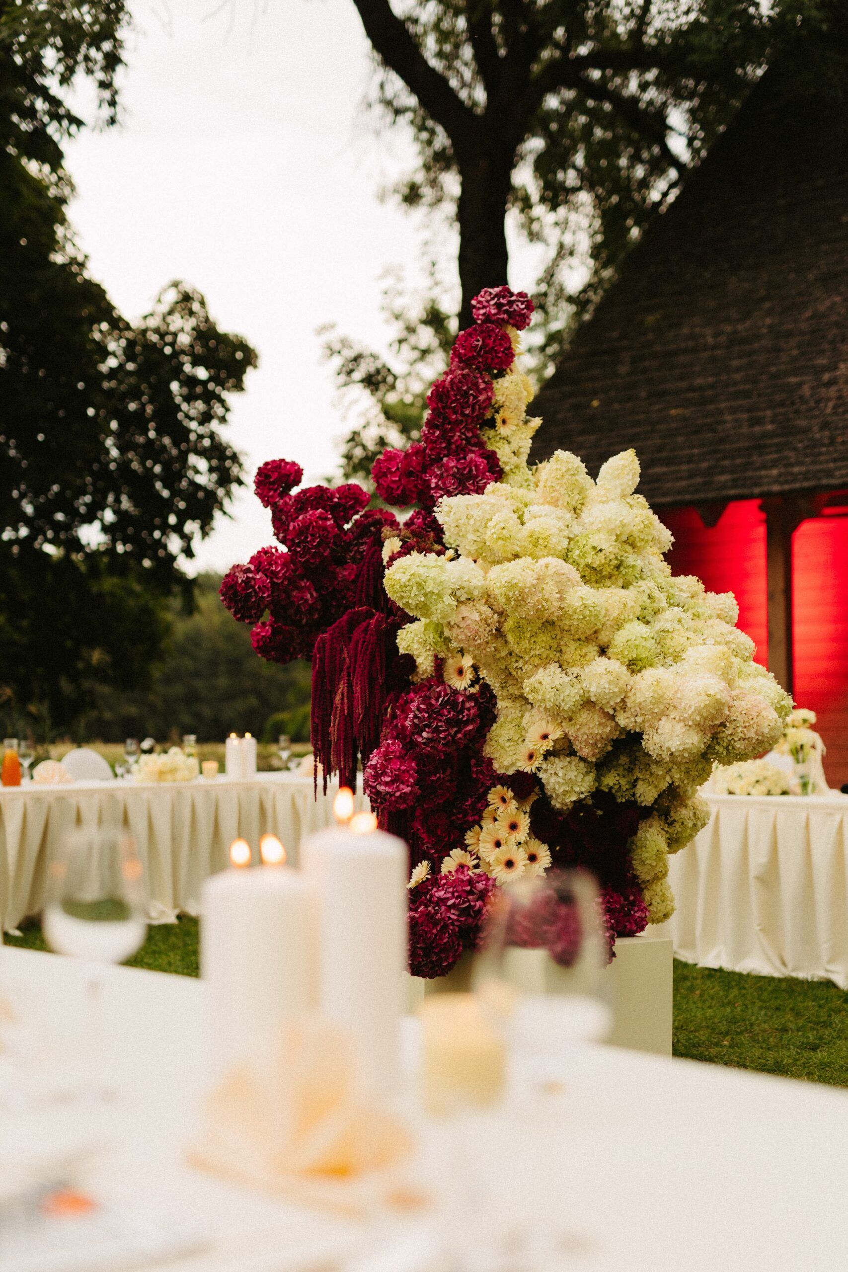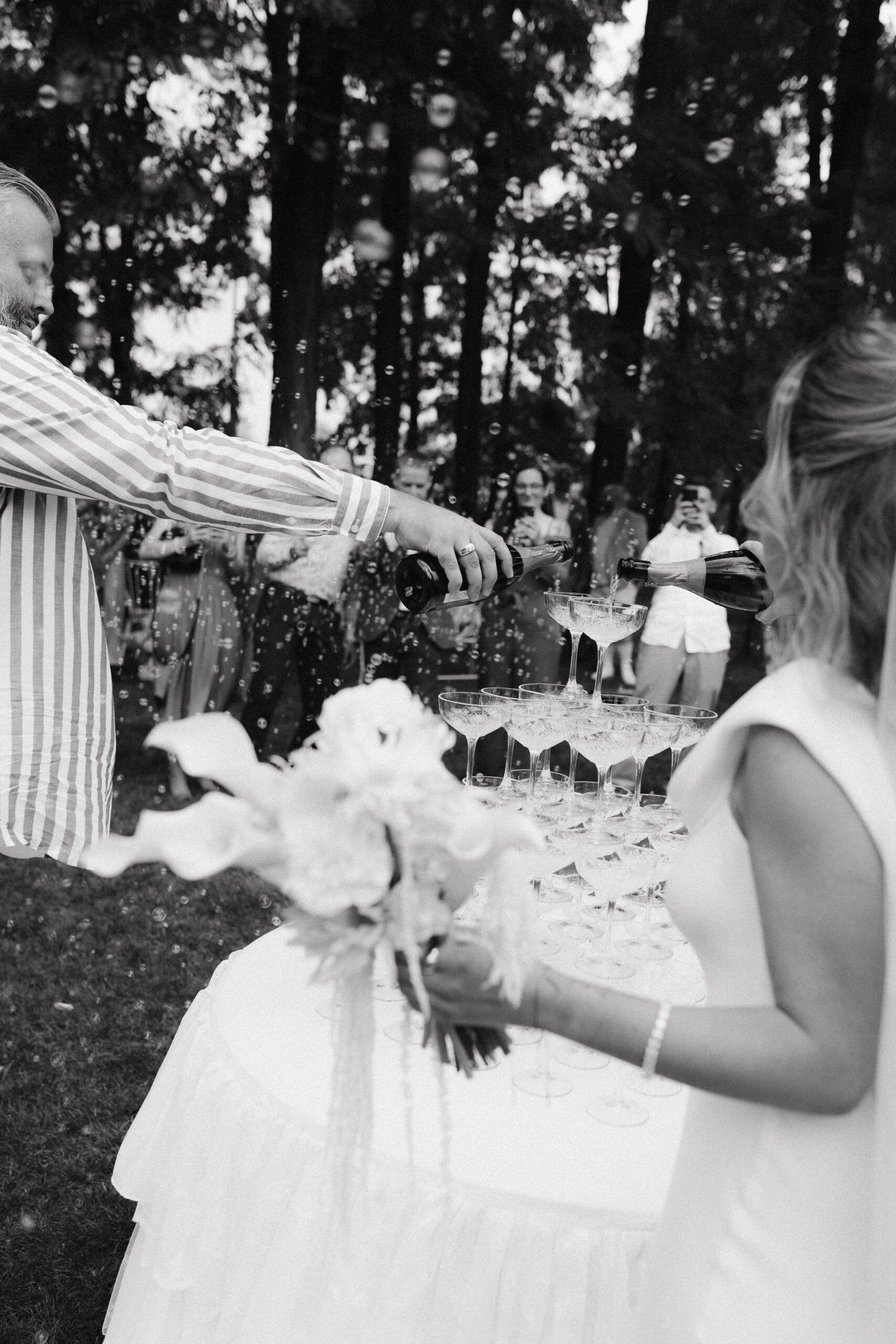 Projekt dla Pauliny i Pawła spełniał wszystkie te założenia. Paulinie zależało aby wesele odbyło się na trawie pod gwiazdami. Naszym zamysłem było intymne, inkluzywne usadzenie gości przy jednym stole. Bez osobnego stołu dla pary młodej. Skupiliśmy się na monochromatycznej kolorystyce aby, wbrew pozorom, jeszcze bardziej wybrzmiał każdy najmniejszy szczegół.