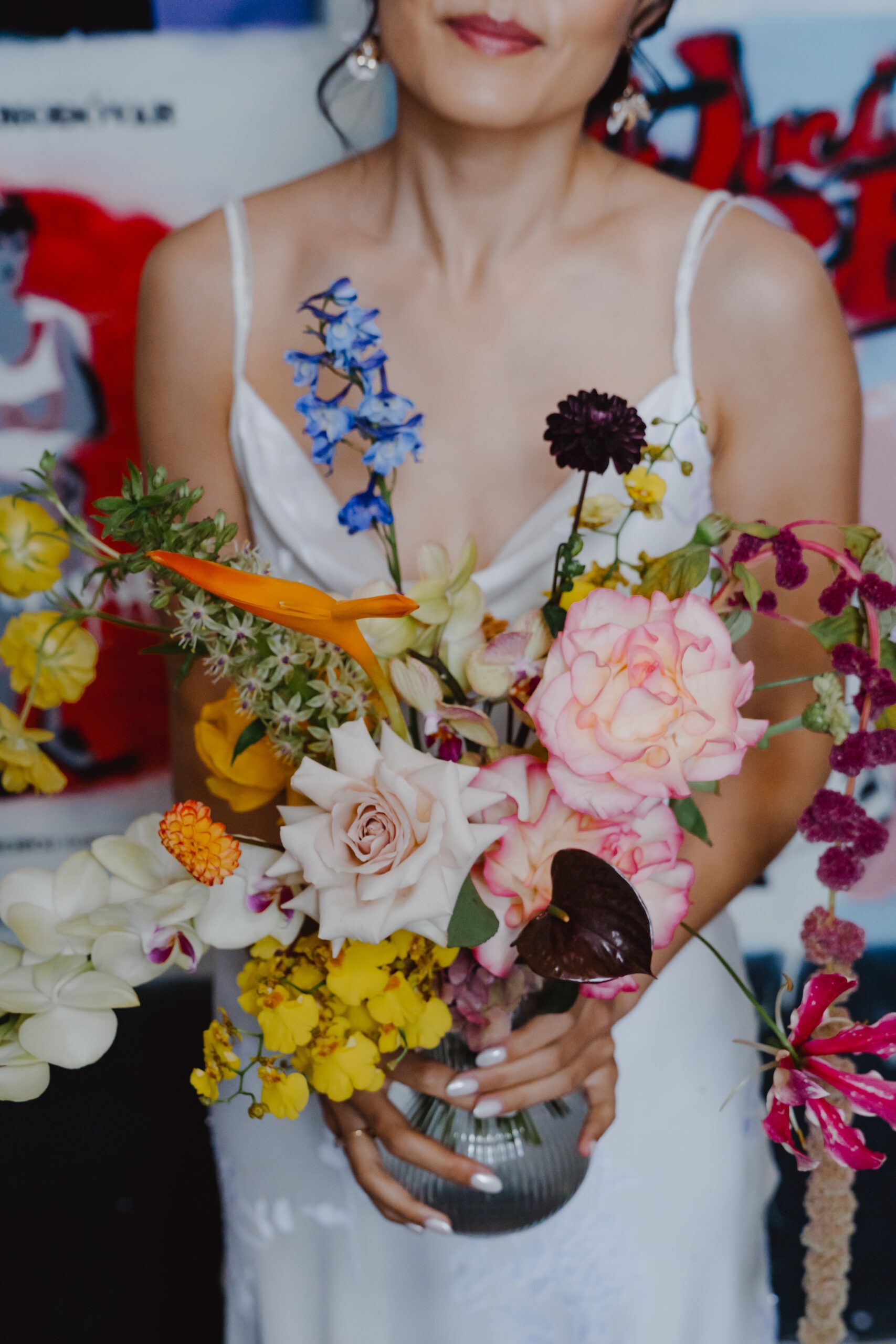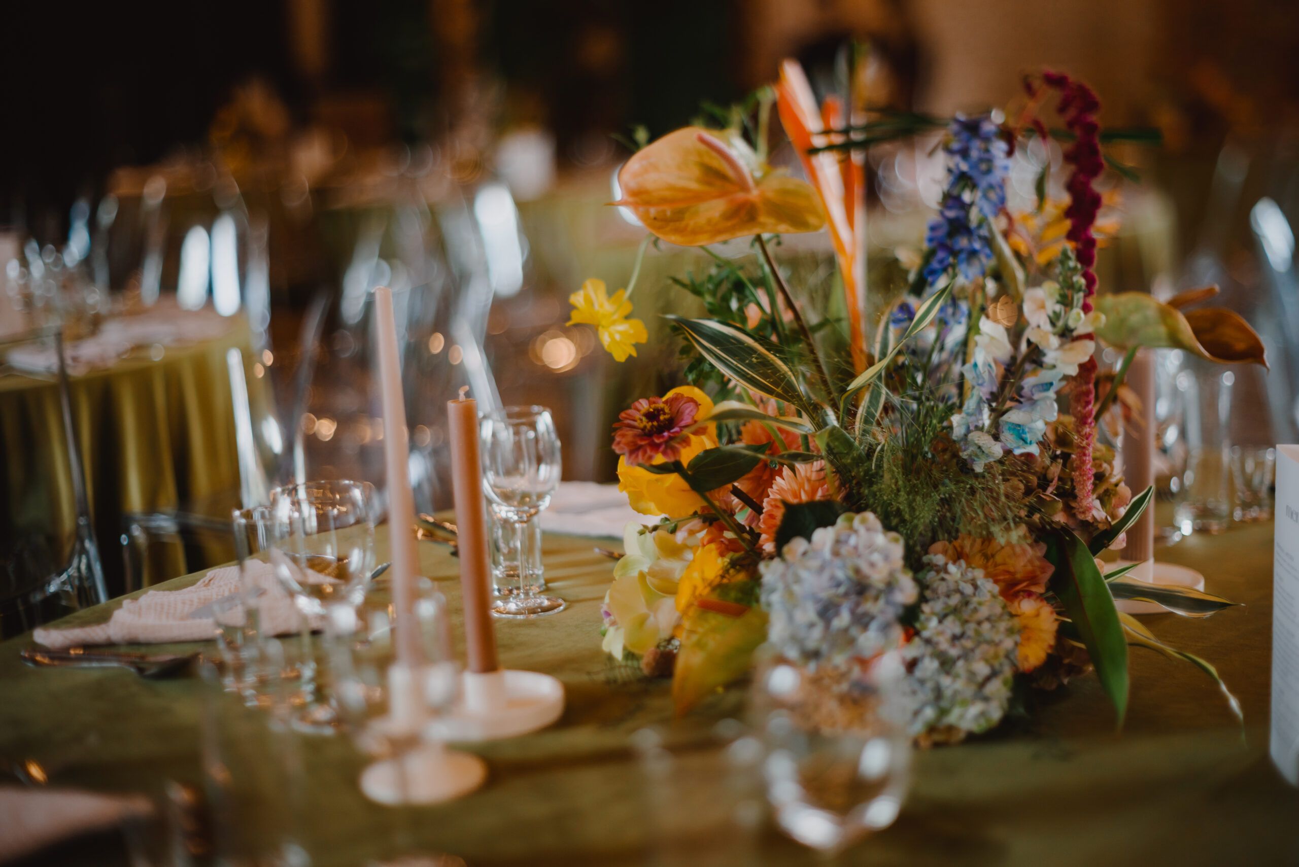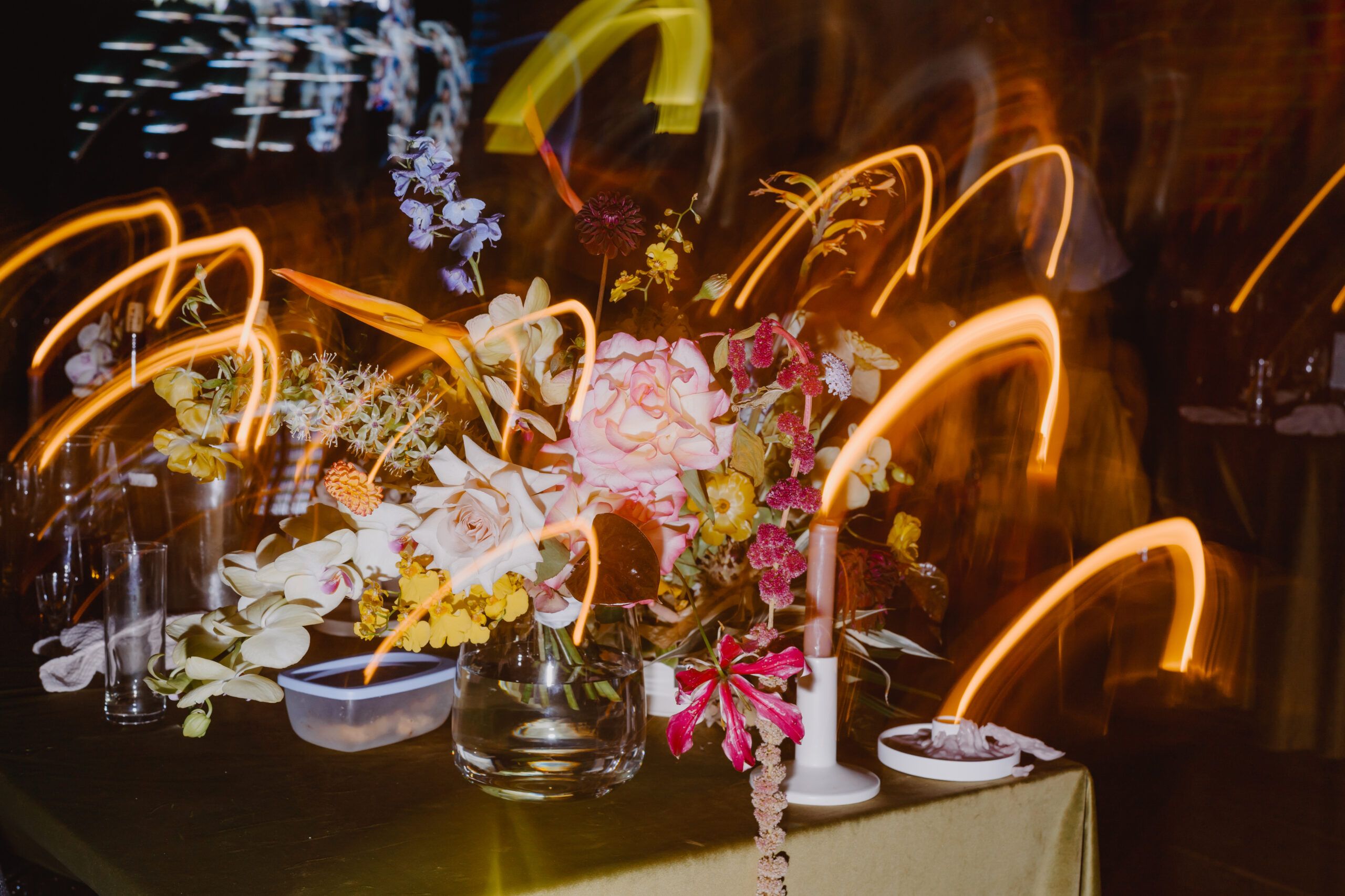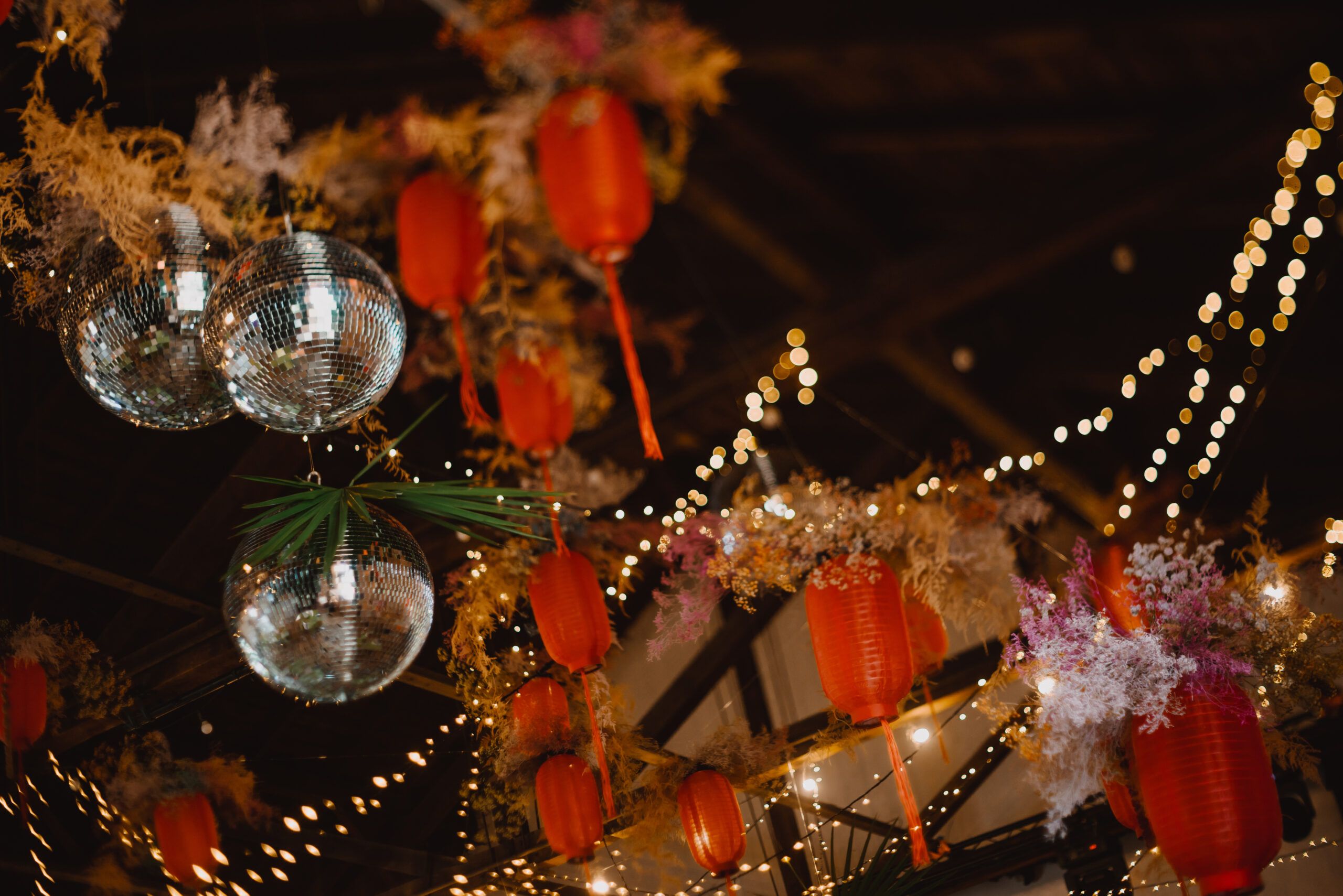 Samą koncepcję oparliśmy na eklektycznym połączeniu stylu nowoczesnego i tropikalnego, z wieloma awangardowymi akcentami. Florystyka to przemyślana selekcja lokalnych kwiatów sezonowych z tropikalnymi, co sprawiło, że cały projekt był oryginalny i niepowtarzalny. Uwagę przyciągały na pewno podwieszenia, czyli połączenie kul disco, girland żarówkowych oraz azjatyckich lampionów, poprzez które stworzyliśmy przytulną i romantyczną atmosferę.